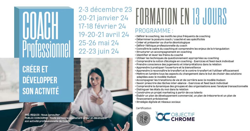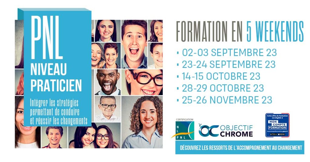 Objectif-CHROME est un centre de formations en Conduite du changement, Coaching, Programmation Neuro Linguistique (PNL) et Hypnose Ericksonienne. Le centre vous accueille à Cornebarrieu, dans la périphérie de Toulouse, à 5 minutes de l’aéroport de Toulouse Blagnac. Notre organisme est certifié QUALIOPI pour ses actions de : Formation professionnelle continue (L. 6313-1-1) – Validation des acquis par l’expérience (L. 6313-1-3)